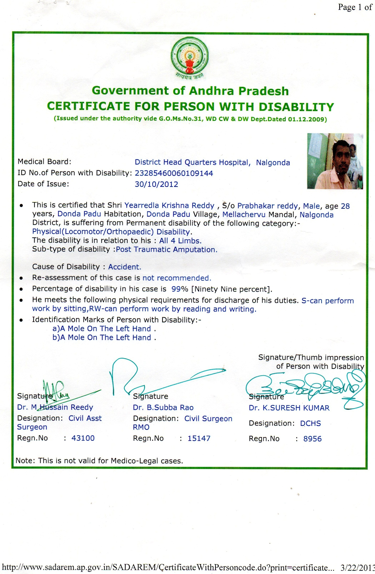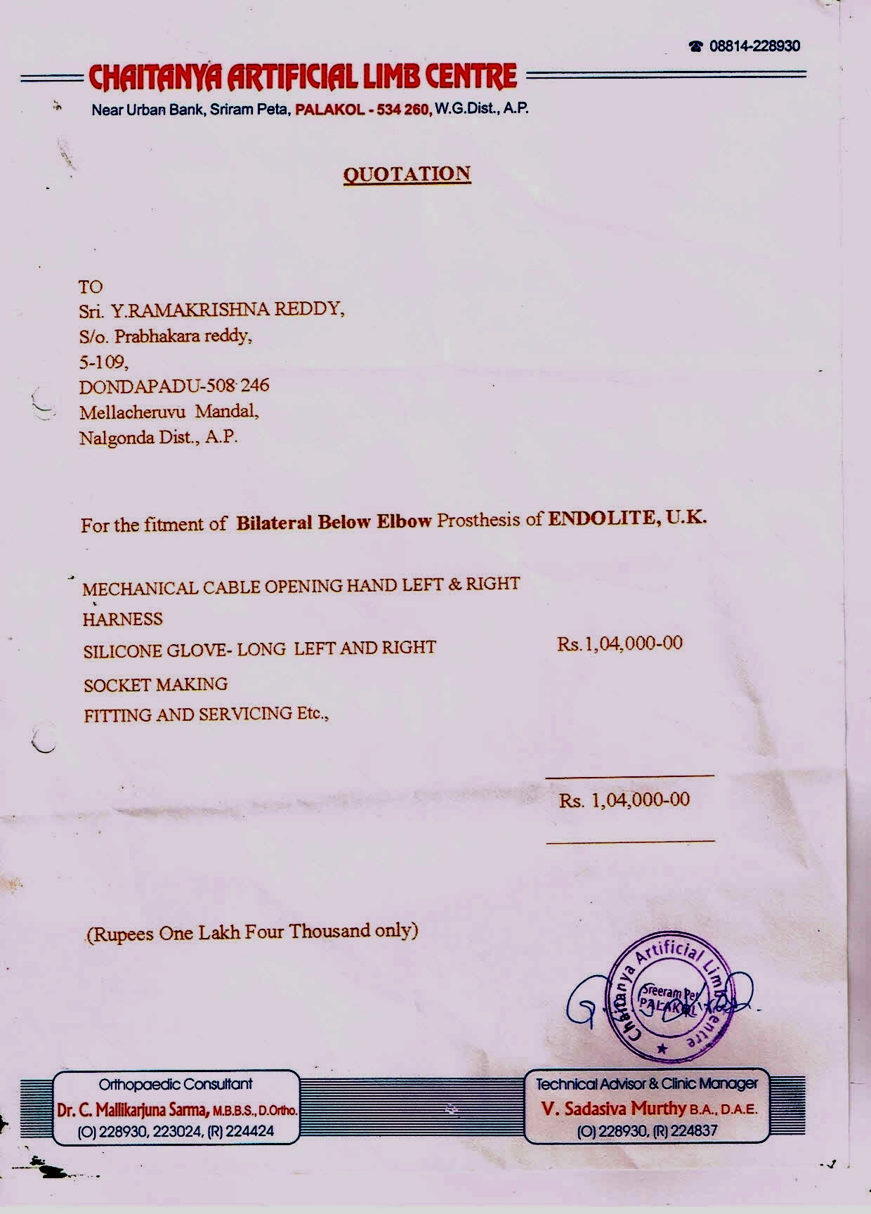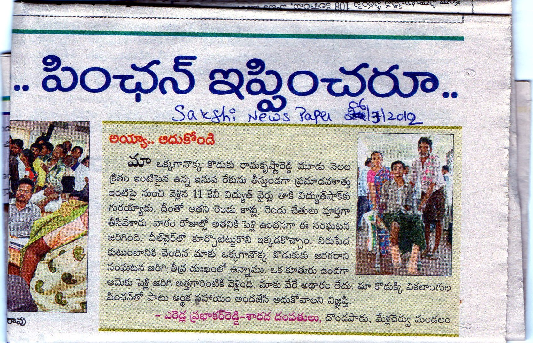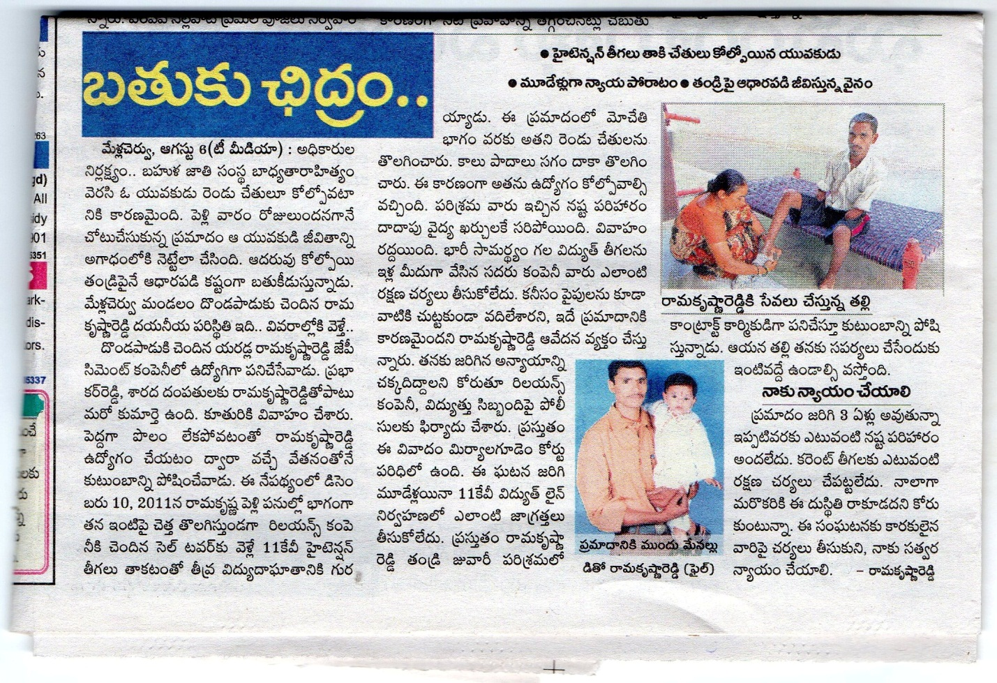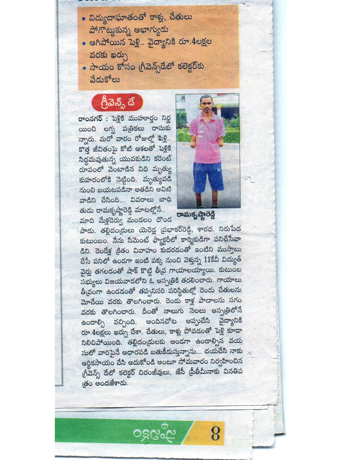 Yearredla Rama Krishna Reddy who lost both his hands & feet due to an electric shock needs our help. He can have artificial limbs so that he could manage all his works on his own. The total estimation for artificial limbs is 1,04,000/- (One lakh four thousand only).